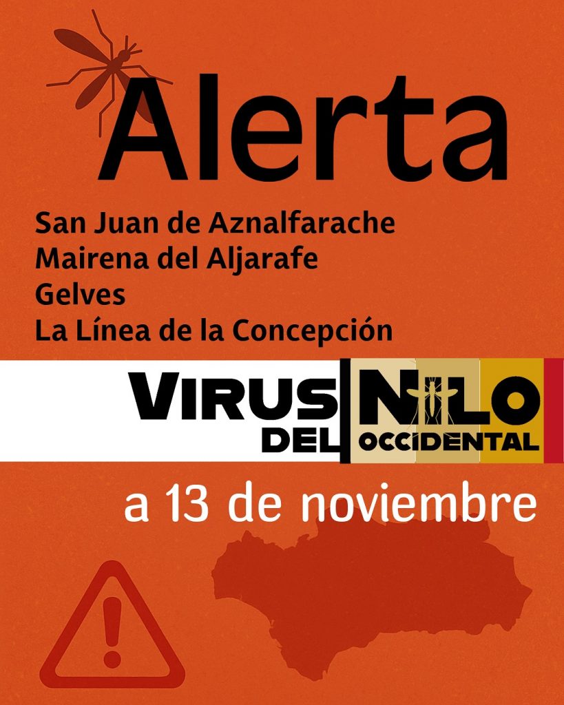 La Consejería de Salud y Consumo de Andalucía ha lanzado una alerta por la detección del Virus del Nilo Occidental (VNO) en mosquitos y un ave en distintas zonas del sur de la comunidad. Los municipios afectados son San Juan de Aznalfarache, Mairena del Aljarafe, Gelves y La Línea de la Concepción, además de Aznalfarache, donde se han reforzado las medidas de vigilancia y protección.
