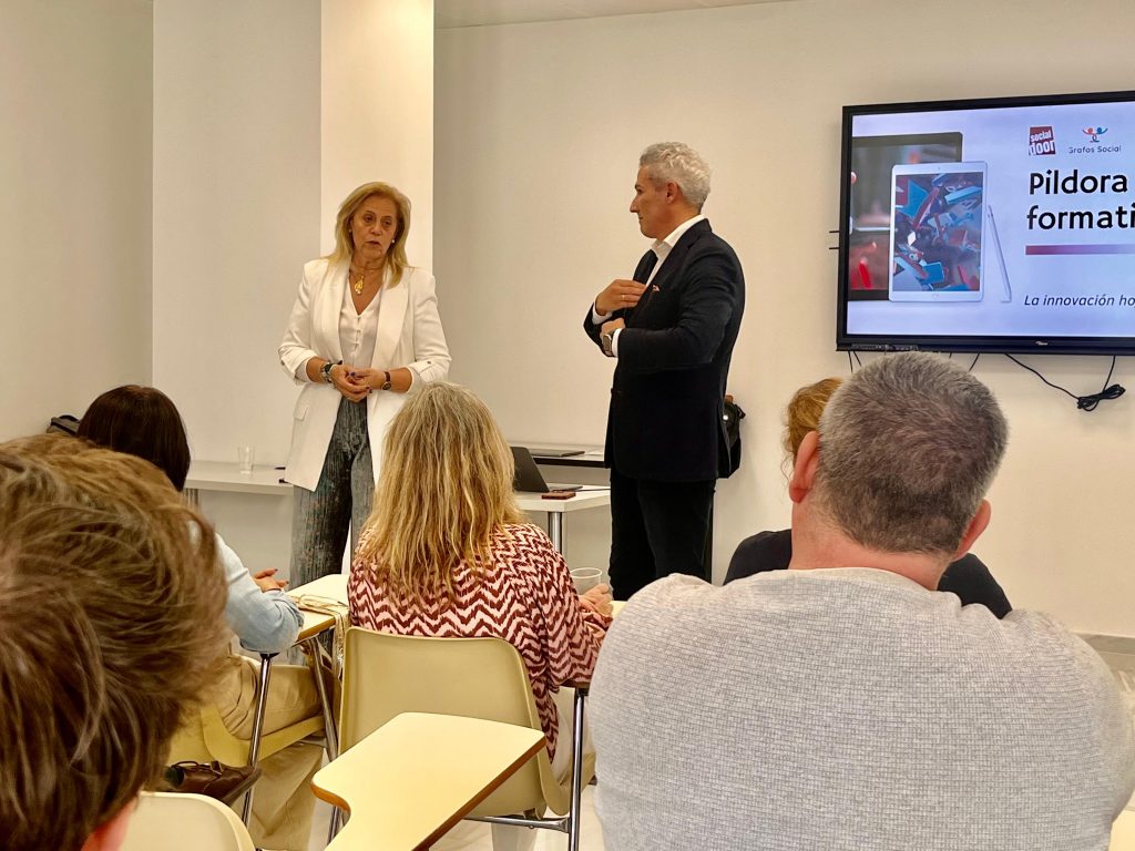 La segunda parte de la jornada ha estado a cargo de Carlos López, presidente de la Asociación Grafos y Marta Aramayo, Técnica de empleo de la asociación. López ha presentado el nuevo programa formativo que, en colaboración con la Asociación de Comerciantes y Empresas, se pondrá en marcha en Bormujos. Se trata de un proyecto de carácter social que tiene como objetivo la formación e inserción laboral de diferentes colectivos sociales.