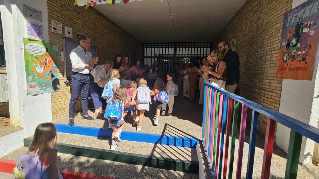 A las 12:00 comenzaron a entrar los escolares en el CEIP José Payán donde han iniciado el curso 25-26 más de 500 alumnos. Llegaba el profesorado con una pancarta muy especial dedicada a los alumnos de 6 de primeria «Mi último primer día de Primaria». Allí le esperaba una fuerte ovación de alumnos y padres. La directora del centro, Ruth Rodríguez, junto al Delegado de Educación, Carlos Amado, visitaron una de las clases. Allí se dirigió al alumnado de 6º «Esperamos que el curso marche estupendamente. Hoy es un día de muchas emociones, da gusto ver vuestras caras de alegría». Carlos Amado, recordó el trabajo realizado durante los meses de verano por los trabajadores municipales «para tener todas las instalaciones a punto para que este día todo funcione con total normalidad».