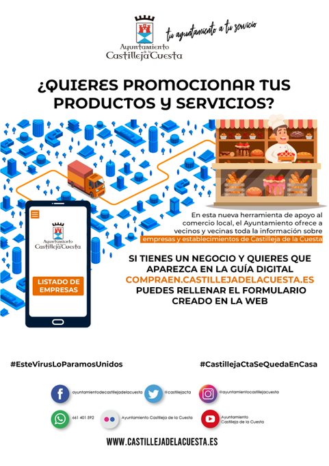 El Ayuntamiento de Castilleja de la Cuesta ha creado una guía digital que pone a disposición de todas las empresas del municipio para que puedan hacer promoción de sus productos y servicios a vecinos y vecinas. Esta medida forma parte del Plan de Apoyo al Comercio Local que el Consistorio ha puesto en marcha para dinamizar la economía del municipio y paliar las secuelas de la actual crisis sanitaria, provocada por el Covid-19, y que incluye la supresión de ciertas tasas.