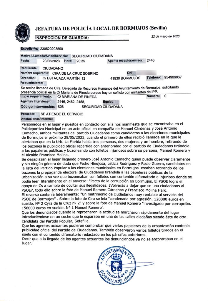 Inmediatamente se desplazan hacia la zona que los vecinos les habían indicado, y efectivamente se encuentran a tres candidatos que van en la lista del Partido Popular, en concreto los números cuatro, dieciséis y diecinueve, quitando de los buzones y tirando los folletos de Ciudadanos y metiendo en los mismos el folleto anónimo, y según continua explicando Romero “se fueron en un coche nada más vernos, excepto la candidata número 19, Leticia Rodríguez, a la que le indicamos que íbamos a llamar a la policía. Ella, tras llamar a varios miembros del partido por teléfono, recibió una llamada instándole a que se marchara del lugar, cosa que hizo justo antes de que se personaran los agentes de la Policía Local, algo que tenemos grabado en vídeo”.