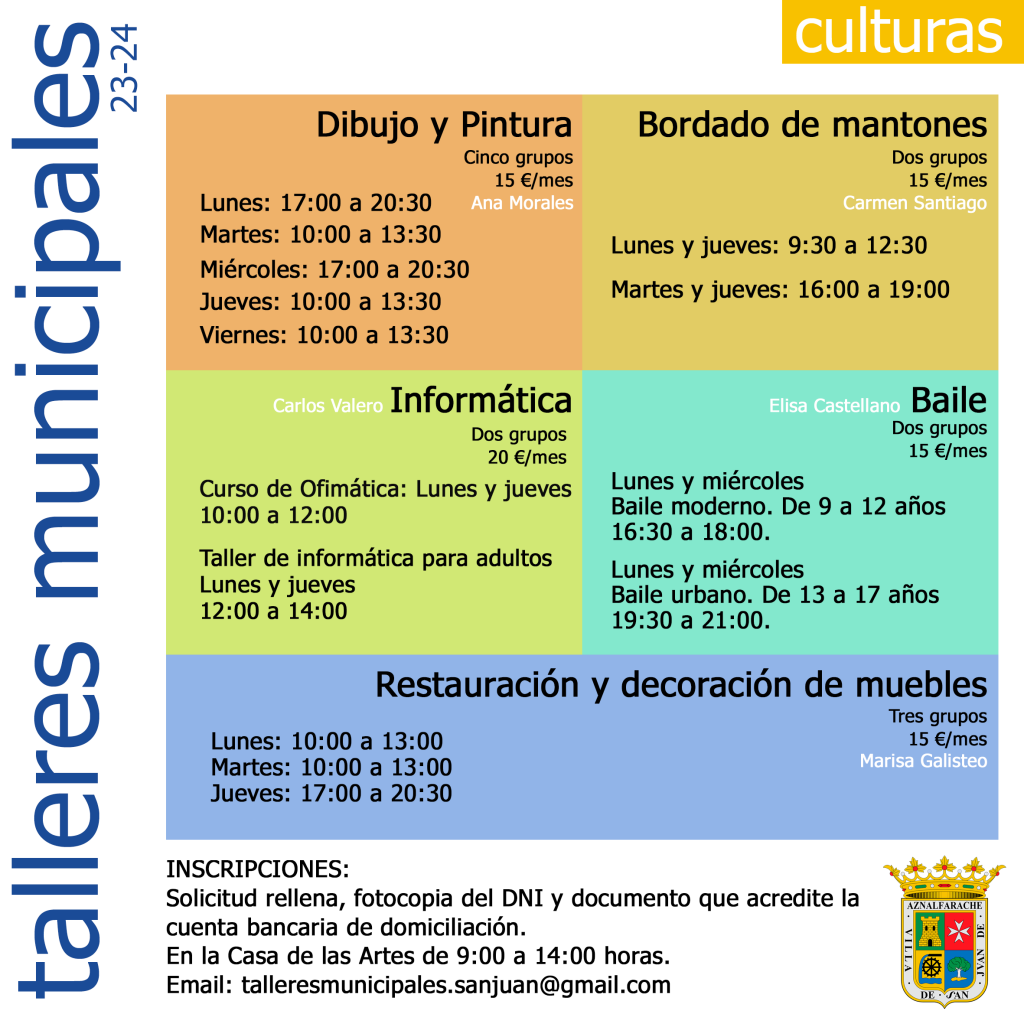 La delegación de Culturas del Ayuntamiento de San Juan de Aznalfarache ha abierto el plazo de inscripción en los talleres municipales para el curso 2023-24. Doce propuestas que mantienen la programación clásica centrada en las actividades artesanales, artísticas y culturales. También la Biblioteca Municipal Mateo Alemán mantiene su oferta de clubes de lecturas, excursiones y talleres de teatro.