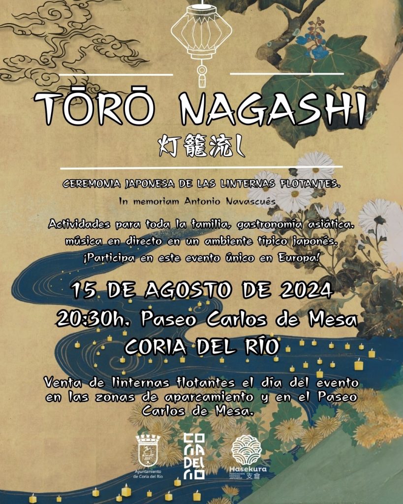 Coria del Río se prepara para acoger un nuevo año la ceremonia Tōrō Nagashi, una tradición japonesa que tendrá lugar el 15 de agosto para velar por las almas y desear la paz en el mundo que sólo se celebra, fuera de Japón, en la localidad sevillana, y siempre con alguien nacido en el país oriental como testigo. Se trata de una ceremonia llena de espiritualidad, esteticismo y sentimiento que comenzará a las 20:30h en el monumento Yashiro en Orilla, conocido como «Templo de las almas», levantado por el artista japonés Kiyoshi Yamaoka, para después depositar farolillos en el Guadalquivir.