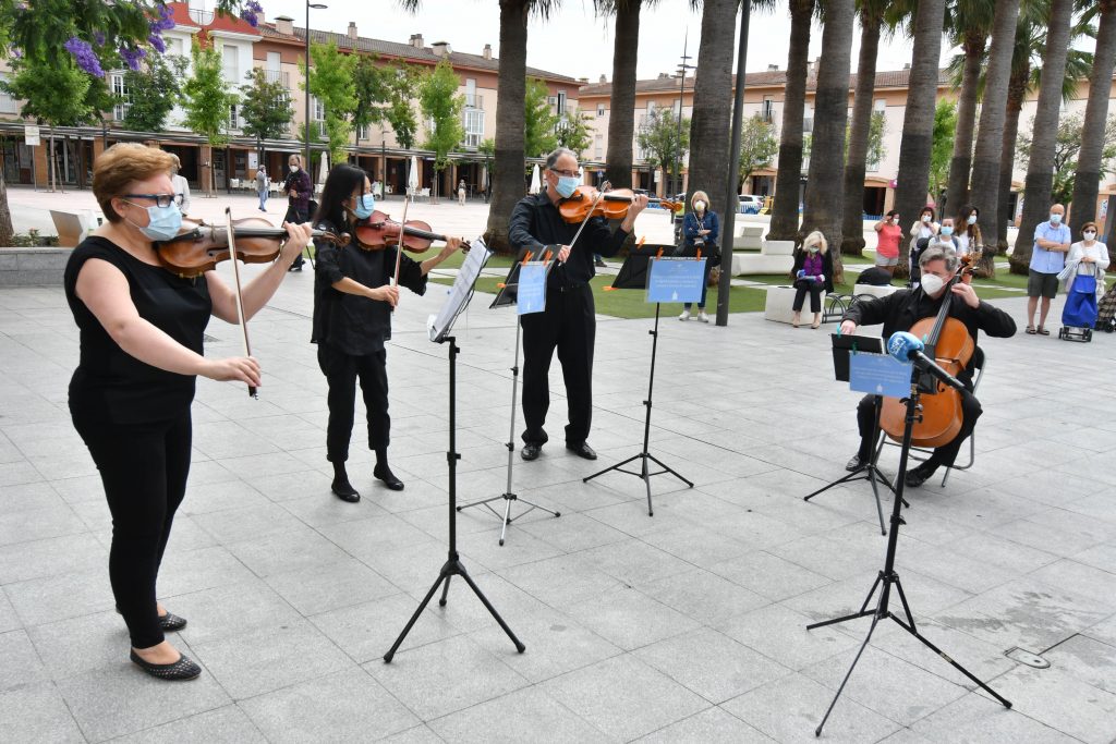 El cuarteto, Matthew Gibbon (contrabajo), Elena Polianskaya (violín), Zhiyun Wang (violín) y Kiril Nikolov (viola), ha tocado a las 9:30 horas frente a la entrada del Centro de Salud de Tomares, donde han agradecido a todo el personal sanitario y a la directora del centro, Concepción Pérez Albújar, su labor y los cuidados dispensados a los vecinos de Tomares durante el confinamiento y las distintas fases de desescalada.