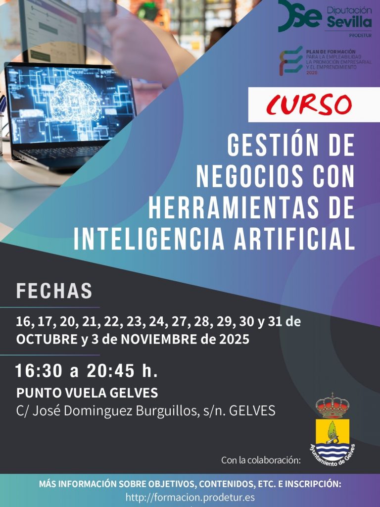 La Delegación Municipal de Desarrollo Local informa de la próxima celebración en nuestra localidad del curso “Gestión de Negocios con herramientas de Inteligencia Artificial” organizado por Prodetur en colaboración con el Ayuntamiento de Gelves. Se trata de una acción formativa gratuita de 52 horas de duración dirigida a personas desempleadas, empresarios/as y profesionales, que deseen mejorar sus habilidades de gestión, actualizar conocimientos, modernizar sistemas y afrontar nuevas líneas de negocio.