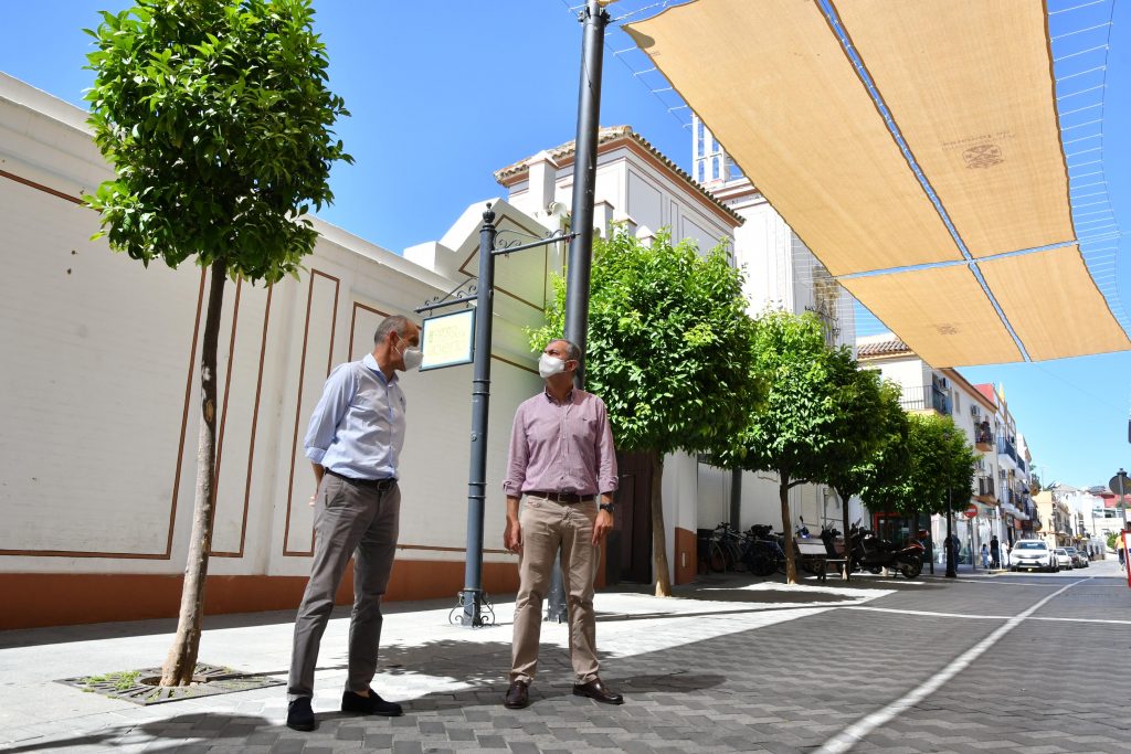 La instalación de toldos, que se ha realizado en un tiempo record en apenas dos semanas, ayudará a combatir el calor en los meses de verano, y posibilitará a los vecinos comprar con más comodidad en la zona de mayor concentración comercial de Tomares ubicada en las calles del centro peatonales.