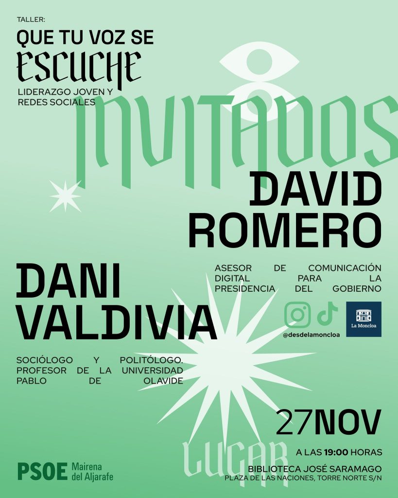 El PSOE de Mairena del Aljarafe organiza el taller “Que tu voz se escuche: liderazgo joven y redes sociales”, un encuentro formativo dirigido a jóvenes del municipio que contará con la participación del asesor de comunicación digital de la Presidencia del Gobierno, David Romero, y del sociólogo y politólogo Dani Valdivia. La actividad tendrá lugar a las 19,00 horas en la Biblioteca José Saramago (Plaza de las Naciones, Torre Norte s/n).