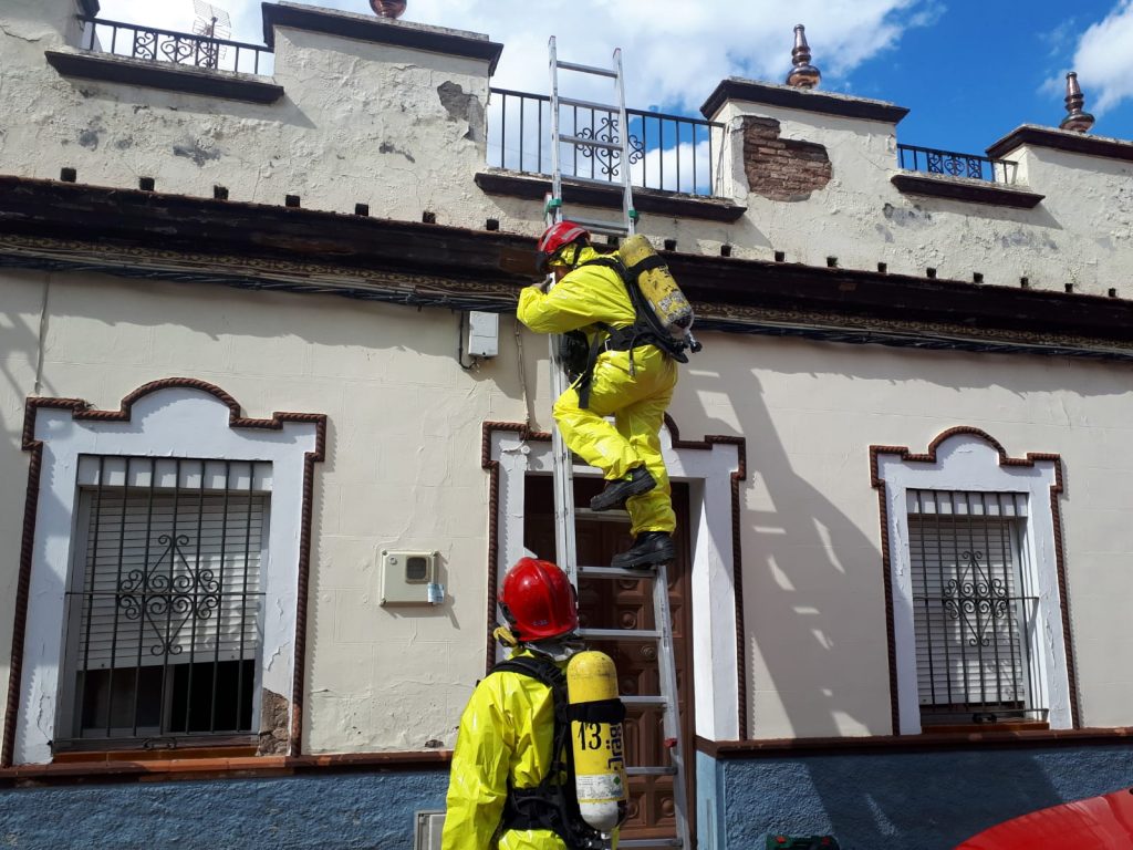 Los bomberos tuvieron que ser requeridos para acceder a la vivienda porque nadie atendía a las llamadas a la puerta. Finalmente, los bomberos del parque de Santiponce se pusieron el traje antisalpicaduro y el ERA y accedieron al interior de la vivienda por la azotea.