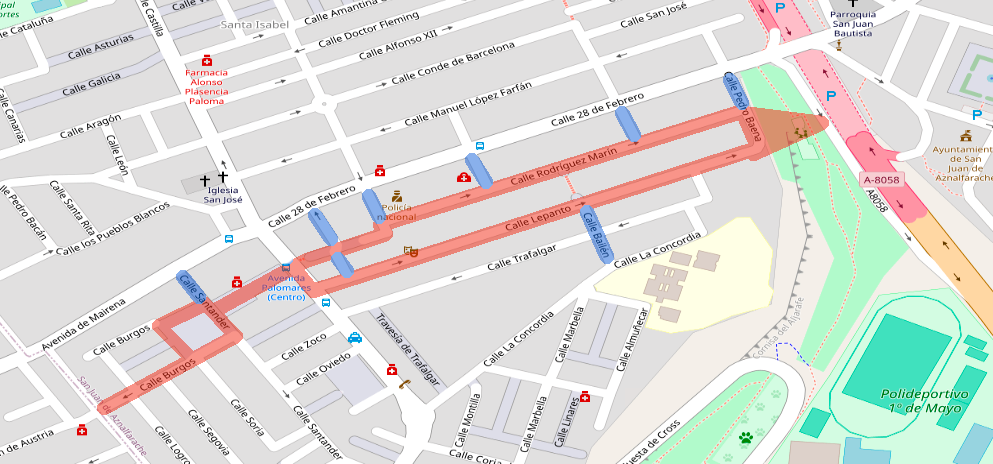 Esta intervención, Fase 1, afectará parcialmente a la calle Burgos, Plaza de la Constitución, calle Santander (parcialmente), Félix Rodríguez de la Fuente, avenida de Palomares (parcialmente), calle Lepanto, Rodríguez Marín, Pedro Baena y parque de Los Pitufos (las dos últimas parcialmente). (Señaladas en rojo en el plano adjunto).