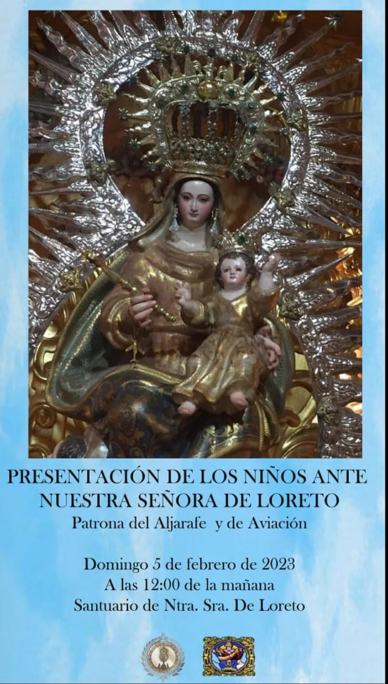 El próximo domingo 5 de febrero en la eucaristía de las 12:00 de la mañana, se presentará a todos los niños que así lo deseen ante la Virgen de Loreto, Patrona del Aljarafe y de aviación. Dicha celebración se llevará a cabo en el Santuario de Loreto de Espartinas.
