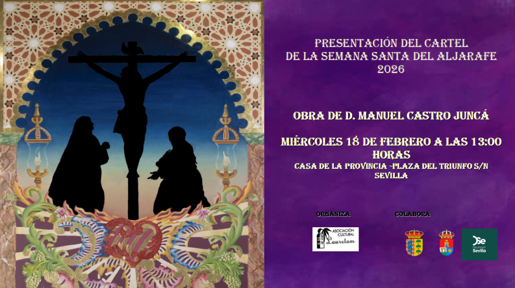 La Asociación Cultural Lauretum ha hecho público que la Presentación del Cartel de la Semana Santa del Aljarafe 2026, obra de D. Manuel Castro Juncá, tendrá lugar el Miércoles de Ceniza, 18 de febrero, a las 13:00 horas, en la Casa de la Provincia, en la ciudad de Sevilla, como viene siendo habitual en los últimos años.