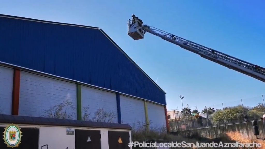 Los bomberos del Aljarafe han acudido al suceso para asegurar el techo ante las fuertes rachas de viento que han chocado contra el polideportivo. Para realizar los trabajos los profesionales han necesitado una autoescala para acceder hasta la cubierta y proceder a asegurarla.