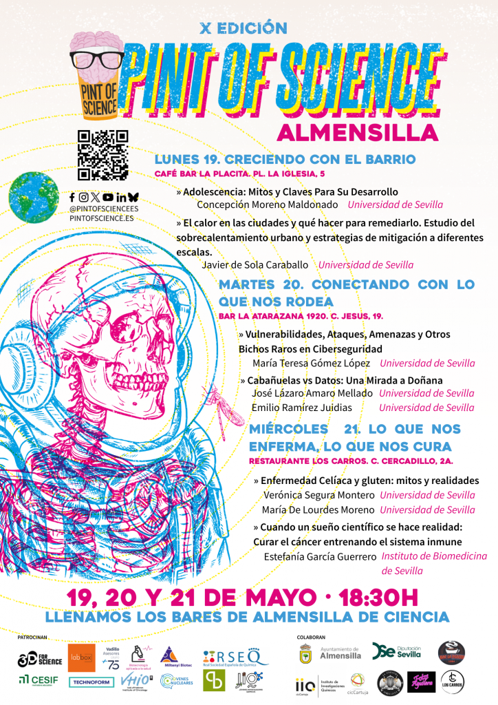 En Almensilla, Pint of Science se celebrará en el Bar La Placita, el Bar Copas Musica La Atarazana 1920 y la Cervecería Los Carros a partir de las 18:30 de la tarde, con un total de 6 charlas científicas que cubrirán temáticas muy variadas como el cambio climático hasta ciberseguridad, entre muchas otras. Entre los investigadores y científicos que participan en esta edición de Pint of Science Almensilla, se encuentran prestigiosos investigadores de la provincia que llevarán de forma cercana y amena sus investigaciones a los bares. El lunes 19, Concepción Moreno Maldonado, ayudará a comprender el desarrollo en la adolescencia y Javier de Sola Caraballo, analizará cómo el sobrecalentamiento urbano afecta a los edificios y al vecindario. El martes 20, María Teresa Gómez López dará las claves para identificar riesgos y amenazas en ciberseguridad, y Emilio Ramírez Juidias y José Lázaro Amaro Mellado expondrán cómo se integra la información geográfica y de teledetección para observar y predecir los efectos del cambio climático. Por último, para cerrar el festival, el miércoles 21 María de Lourdes Moreno Amador y Verónica Segura Montero contrastarán los mitos y realidades de la enfermedad celíaca y otras intolerancias alimentarias, y Estefanía García Guerrero expondrá cómo se puede entrenar al sistema inmunitario para luchar contra el cáncer, usando la terapia con células CAR-T.