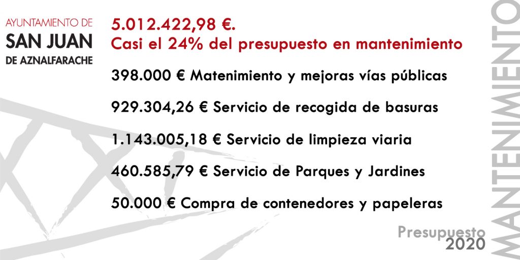 El mayor esfuerzo presupuestario del Ayuntamiento de San Juan de Aznalfarache se concentra en los diversos servicios relacionados con el mantenimiento de la localidad. Son más de cinco millones de euros los que se destinan a esta área que incluye el servicio de limpieza, recogida de basuras, parques y jardines, vías públicas, desratización o alumbrado público. Un esfuerzo, que supone más de 230 euros a cada uno de los 21.416 habitantes del pueblo en 2019.