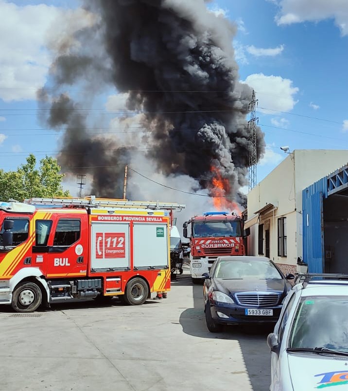 Un incendio de importantes dimensiones se ha desatado este martes en un desguace ubicado en la carretera de Almensilla, en el término municipal de Coria del Río. El fuego, que permanece incontrolado hasta el momento, ha obligado a cortar la vereda posterior al desguace como medida de seguridad.