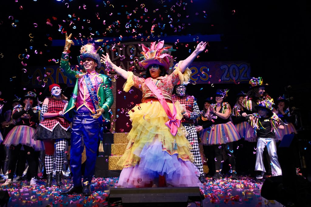 Tras la proyección de vídeos de presentación, los asistentes disfrutaron de un fantástico número musical dedicado a los ‘Dioses del Carnaval’, durante el cual se impusieron las bandas a los Ninfos 2026, Inés Martín García y Ángel Suárez Librero, auténticos ‘reyes’ de la fiesta.
