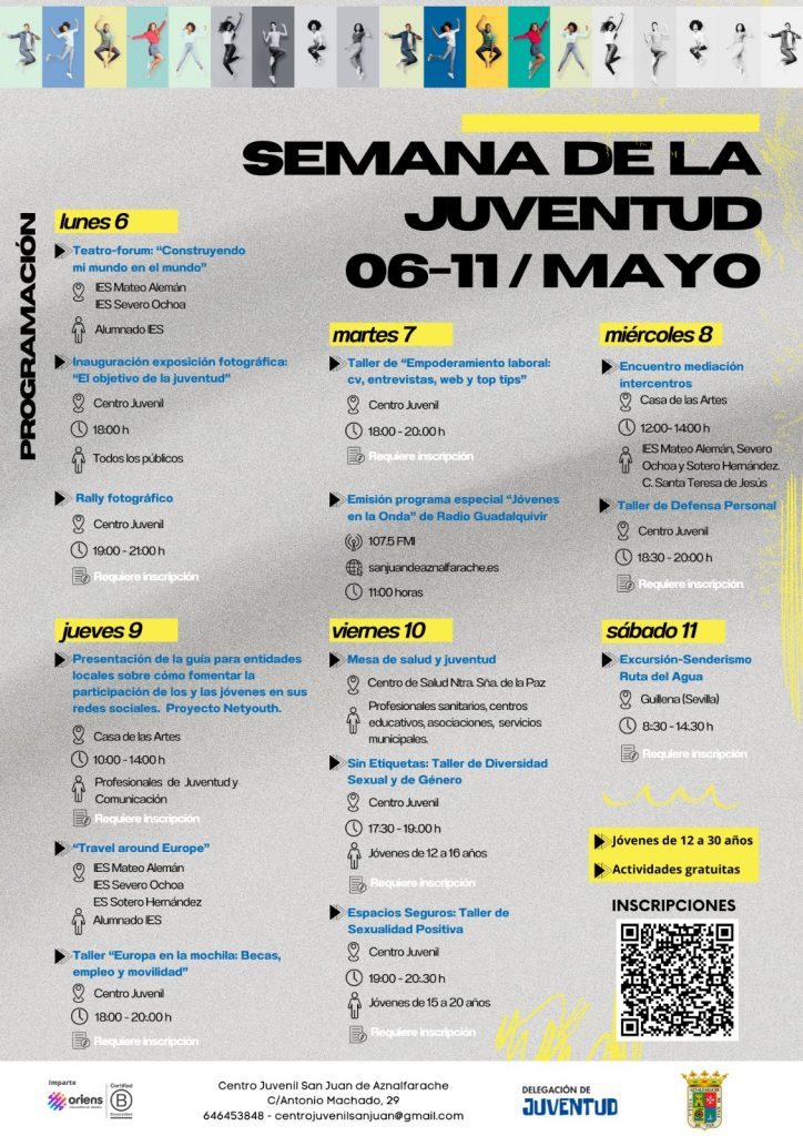 - La Casa de las Artes acogerá la presentación de la guía para entidades locales sobre cómo fomentar la participación de los y las jóvenes en sus redes sociales. Proyecto Netyouth. En el desarrollo de este proyecto, liderado por la Universidad de Sevilla y con la participación de entidades de varios países europeos, ha colaborado el Ayuntamiento de San Juan de Aznalfarache a través de la delegación de Juventud. Esta jornada está dirigida a profesionales de juventud y comunicación. Es necesario realizar la inscripción previa. De 10:00 a 14:00 horas.